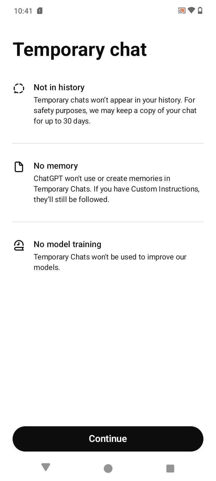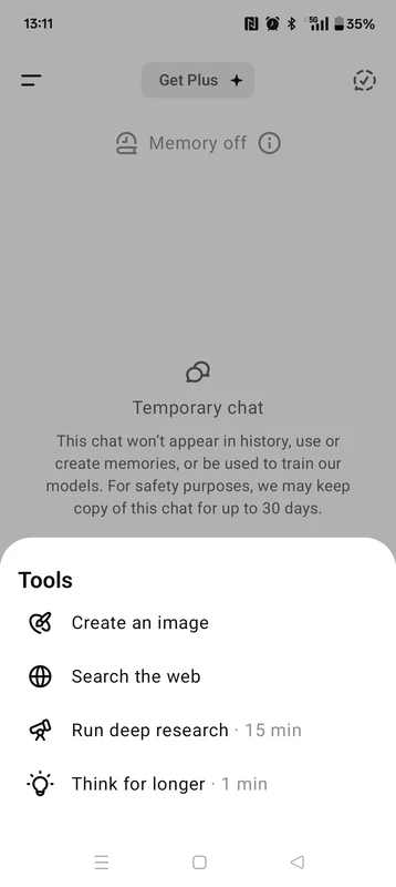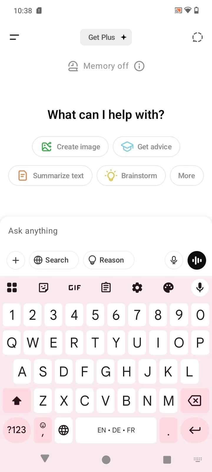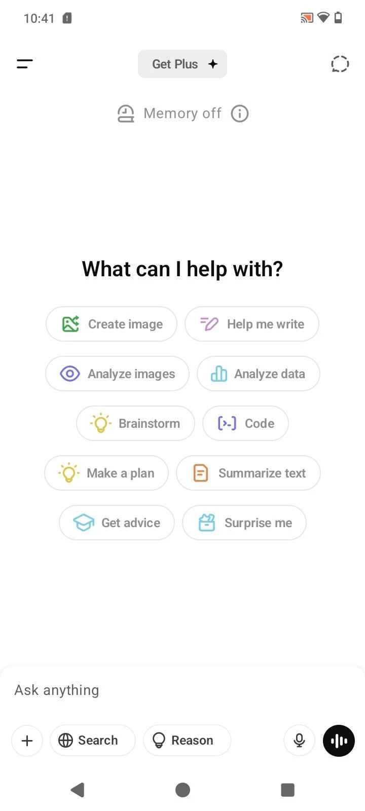 Vous pouvez télécharger et installer ChatGPT depuis le site officiel, le Google Play Store ou simplement en cliquant sur le bouton « Télécharger » sur la page. Lancez l'application en cliquant sur l'icône qui apparaît sur votre écran d'accueil et connectez-vous avec votre compte Google ou créez-en un. L'écran principal s'affiche avec une zone de texte au centre. Vous disposez de trois options pour saisir vos requêtes :